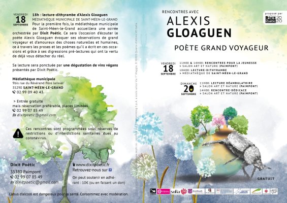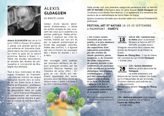 L’association La Plume et la Feuille, organisatrice du festival ART ET NATURE, a donné carte blanche à Dixit Poétic pour l’invitation d’un poète autour de la thématique de son festival. Alexis Gloaguen fut ce poète.